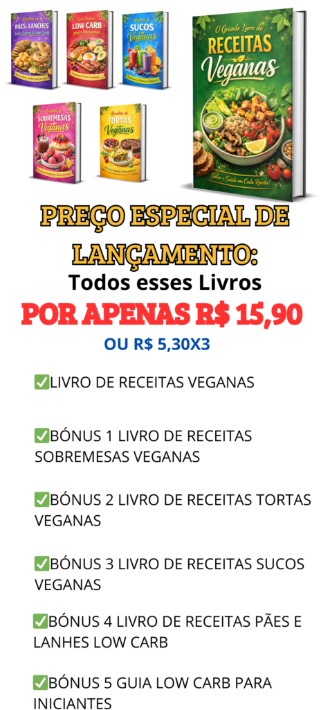 Com o Livro Digital Receitas Veganas, você terá receitas ilimitadas para todos os momentos, combinando saúde, sabor e criatividade em uma alimentação totalmente vegana.